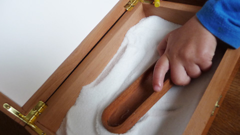 אי שם בתחילת השנה ליה התאמנה על כתיבת אותיות הדפוס במלח שהונח בתבנית אפייה עמוקה. הרעיון הוא שהילד יכול לכתבו את האות באלמנט מוחשי, עם האצבע, להרגיש את התנועה ולחוות חוויה חושית. זה די דומה לרעיון של לממש צורה בתנועה ברת קיימא, לחוות ממש. אותו לוח חול גם שימש לפעמים כמגרש משחקים קטן של חיות ואלמנטים של טבע. המלח היה טבעי (לבן) ואז הפכנו אותו לצבעוני ובסוף נשפך ברובו.ואתם תשאלו, נו , ומה כל זה קשור לענייני חוכמת המזרח? ובכן, ברוח הזן ששורה עלי בימים אלו (חיוך, אל תהיו כאלה רציניים) נולדה קופסת החול לאימון ומשחק. ליה החלה ללמוד את נפלאות כתב היד לאחר שנה של כתב דפוס. ולכבוד המאורע הכנתי לה מתנה קטנה. זה אבולוציה מושקעת יותר של תבנית האפייה, והיא מזכירה את רעיון של גני הזן רק במיני.